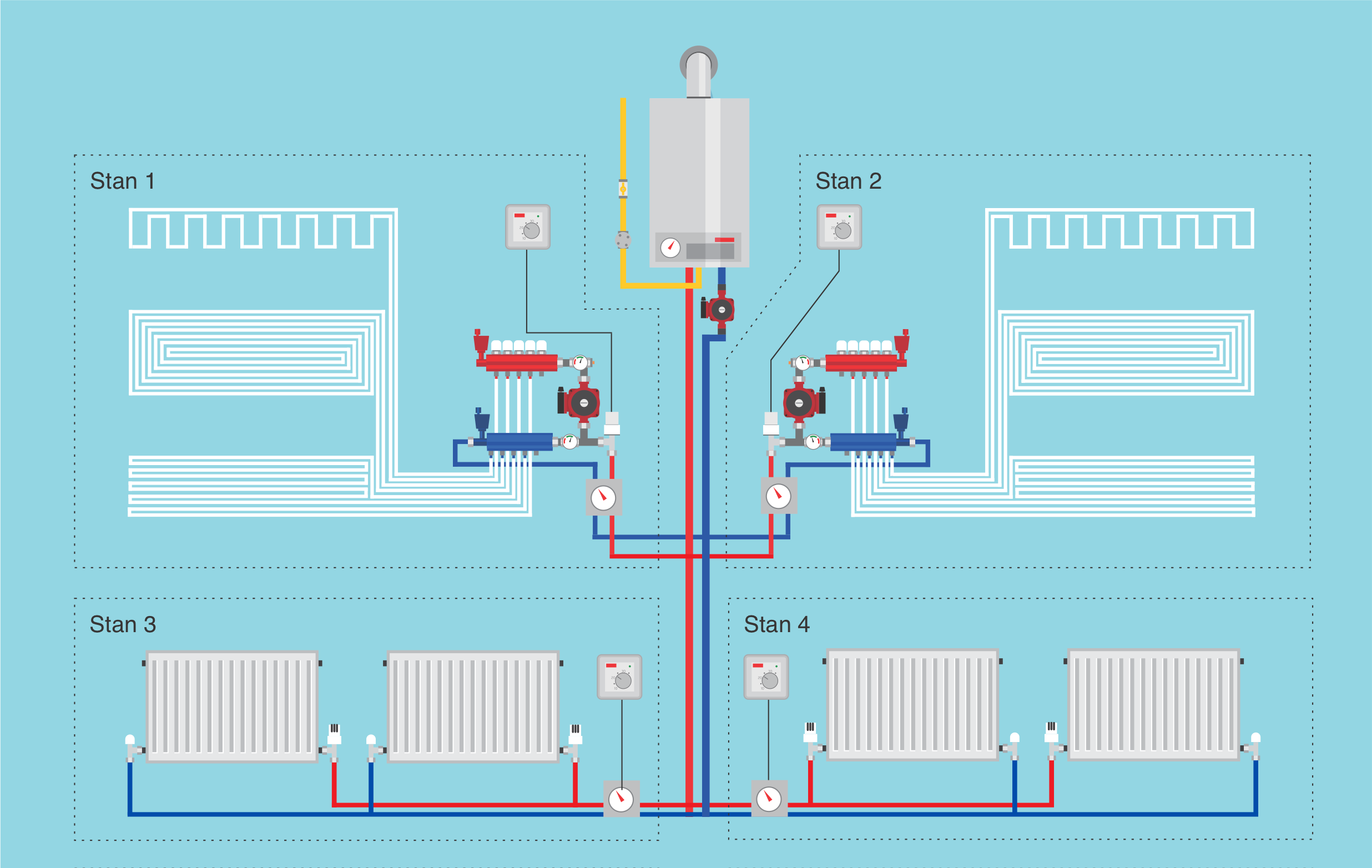U ovom sistemu, kotlarnica na prirodni gas (ili gasni generator) nalazi se u zajedničkom prostoru (podrumu, tehnickoj prostoriji, na krovu ili u dvorištu). Toplotna energija proizvedena u kotlarnici se prenosi kroz cevovodni sistem do stanova u vidu tople vode. Svaki stan je povezan na glavni cevovod putem individualnih podstanica ili direktno iz distributivnog sistema.